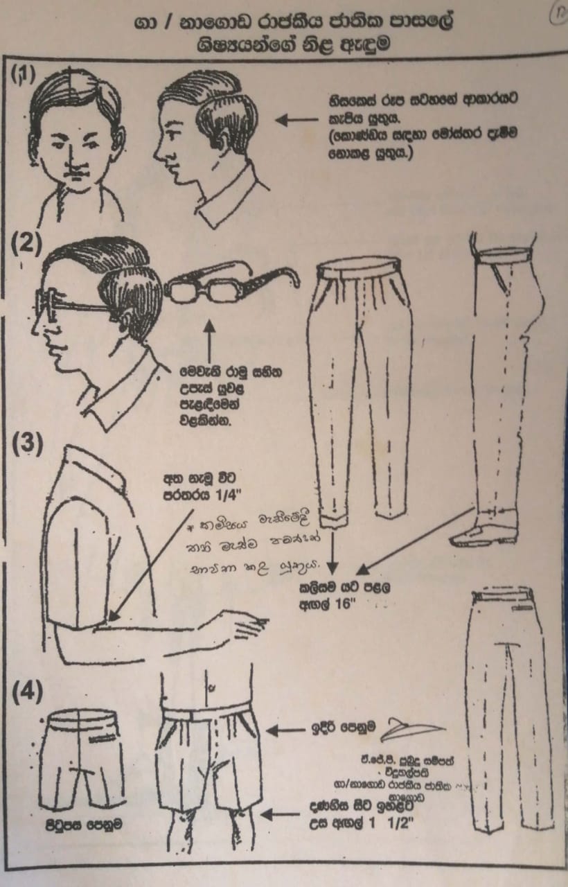 - කලිසමේ පහළ කෙළවර පාවහන් මට්ටමෙන් තිබිය යුතු අතර ඉහළ ඉස්සෙන ආකාරයෙන් පැලදීම නොකල යුතුය.